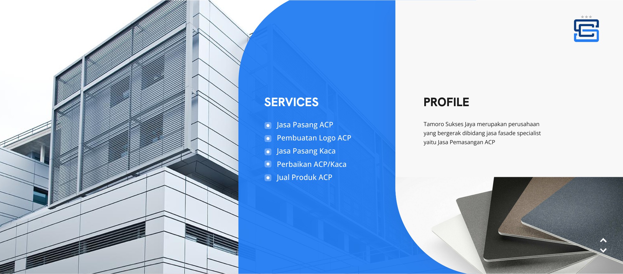 PT Tamaro Sukses Jaya merupakan perusahaan yang bergerak dibidang jasa fasade specialist diantaranya Pemasangan ACP (Aluminium Composite Panel). Perusahaan kami telah banyak mendapatkan kepercayaan dalam pembangunan gedung bertingkat perkantoran, ruko/toko, dan jenis bangunan lainnya baik perusahaan atau perorangan.